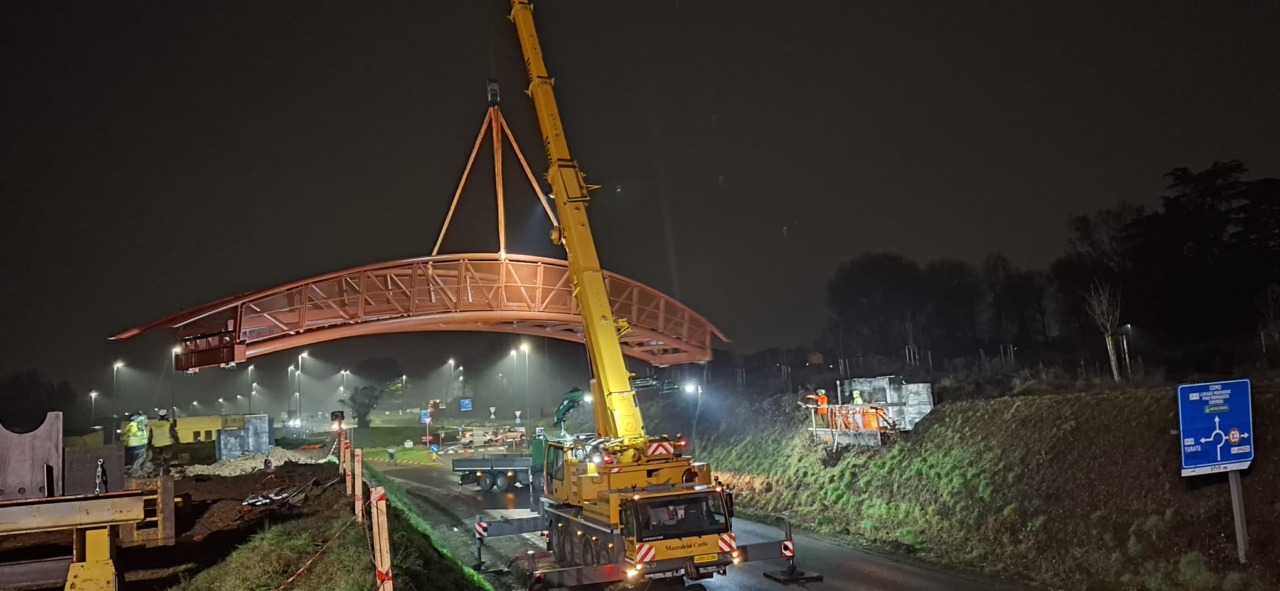 Nei giorni scorsi a Lomazzo sono state varate le passerelle ciclopedonali con luce di 15 metri su via Cavour e sulla SP32, della luce di 38 metri, nell’ambito del progetto che collega il parco dell’ex cotonificio Somaini – Parco Scientifico Tecnologico Como NEXT – con la stazione ferroviaria, il polo scolastico e le aree agricole del Parco del Lura verso Cascina Braghe e Manera. Tale connessione si sviluppa lungo l’asse della Strada Cavallina/Strada Luganese, antico tracciato medievale che univa l’area milanese al Mendrisiotto. Entrambe le passerelle sono progettate per sfruttare il naturale dislivello tra le strade e le aree agricole, permettendo così di ridurre la lunghezza delle rampe di accesso e garantire una migliore integrazione paesaggistica.