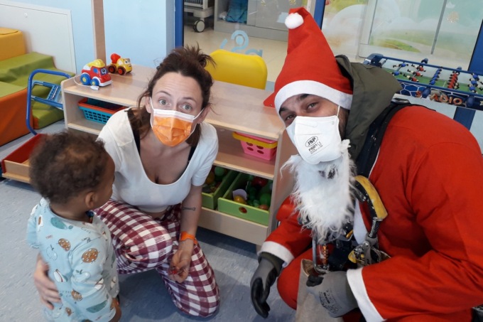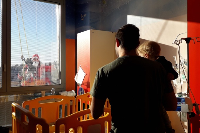 Niente camino: quest’anno Babbo Natale per i bambini ricoverati all’ospedale Del Ponte è arrivato passando dalle finestre… appeso dal tetto.