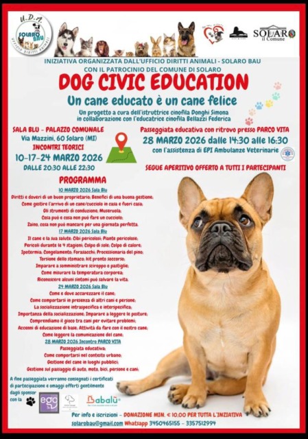 “Un cane educato è un cane felice”. Sono partiti da questo presupposto i volontari dell’Ufficio diritti animali – Solaro Bau nel proporre una nuova iniziativa dedicata a tutti coloro i quali posseggono un cane.