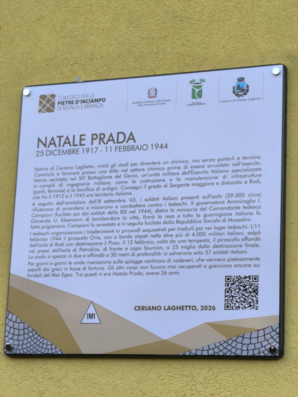 Martedì mattina, in occasione della “Giornata della Memoria”, in via Manzoni a Ceriano Laghetto, è stata posata una pietra d’inciampo che ricorda Natale Prada, giovane cerianese nato il 25 dicembre 1917 e disperso nel Mar Egeo durante la Seconda guerra mondiale, mentre era prigioniero delle truppe tedesche.