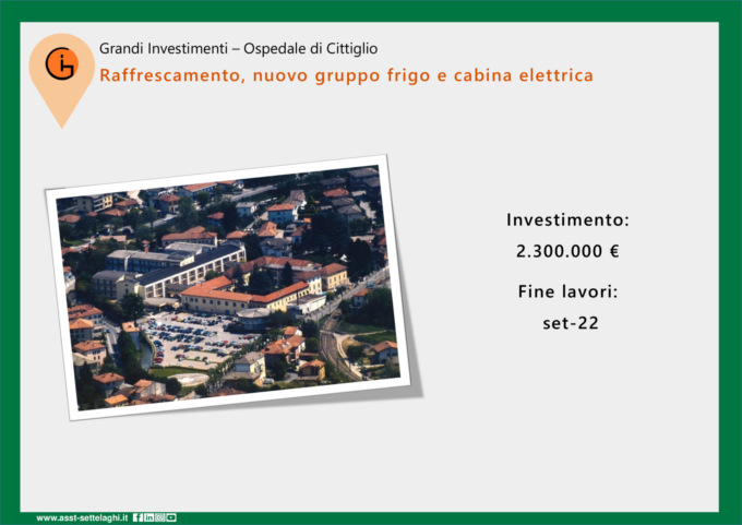 In altri la fine dei lavori è prevista per l’anno in corso, come la ristrutturazione del Pronto Soccorso e dell’Endoscopia di Tradate, 900mila euro di investimento che sarà concluso per l’inizio dell’estate prossima, o la ristrutturazione del Nucleo moderno e la realizzazione della nuova Dialisi CAL all’Ospedale di Cittiglio, lavori del valore di 640mila euro, chiusi entro il prossimo autunno.