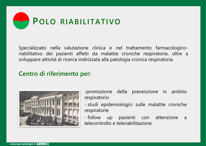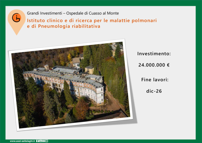 L’intervento più consistente è quello che riguarda l’Ospedale di Cuasso al Monte: 24 milioni di euro stanziati per realizzare il grande progetto dell’Istituto Clinico e di Ricerca per le Malattie polmonari e di Pneumologia riabilitativa. Per la fine del 2026 il Padiglione Centrale e l’ex Convento saranno oggetto di un importante intervento che permetterà di ospitare in quelle sedi il Polo riabilitativo specializzato nella valutazione clinica e nel trattamento farmacologico-riabilitativo dei pazienti affetti da malattie croniche respiratorie, oltre che l’attività di ricerca indirizzata alla patologia cronica respiratoria in collaborazione con l’Università dell’Insubria.