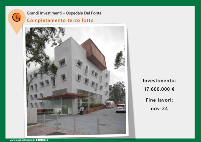 All’Ospedale Del Ponte di Varese è ormai definito il progetto per la realizzazione del cosiddetto ‘terzo lotto’, che completerà il Polo per la Donna e il Bambino migliorando i percorsi e l’accessibilità: 17,6 milioni di euro di investimento, fine lavori prevista per novembre 2024.