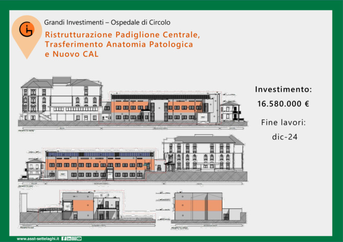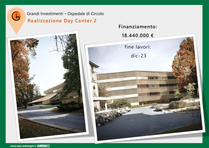 All’Ospedale di Circolo di Varese il Day Center 2 sarà ultimato per il dicembre del 2023, grazie ai 18,4 milioni di euro destinati allo scopo, mentre un anno dopo, nel dicembre 2024, ultimata la ristrutturazione del Padiglione Centrale, sarà realizzata la nuova Dialisi CAL, grazie ai 16,5 milioni di euro investiti.