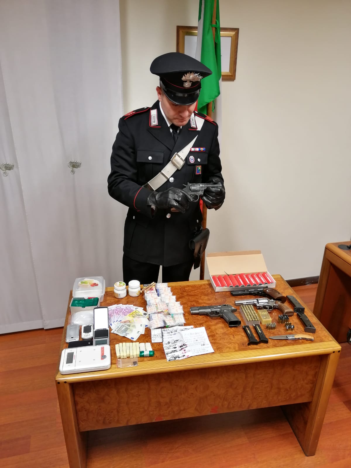 In casa sua i Carabinieri hanno trovato e sequestrato due bilancini elettronici di precisione, 120 grammi di hashish e 40 grammi di cocaina, già suddivisi in dosi.