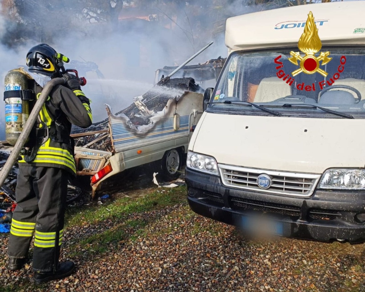 Sul posto hanno operato due autopompe, un’autobotte e un pickup con modulo antincendio. Le squadre sono riuscite a circoscrivere rapidamente le fiamme, evitando che si propagassero ad altri veicoli. In totale l’incendio ha interessato quattro camper e una roulotte. Fortunatamente non si registrano feriti.