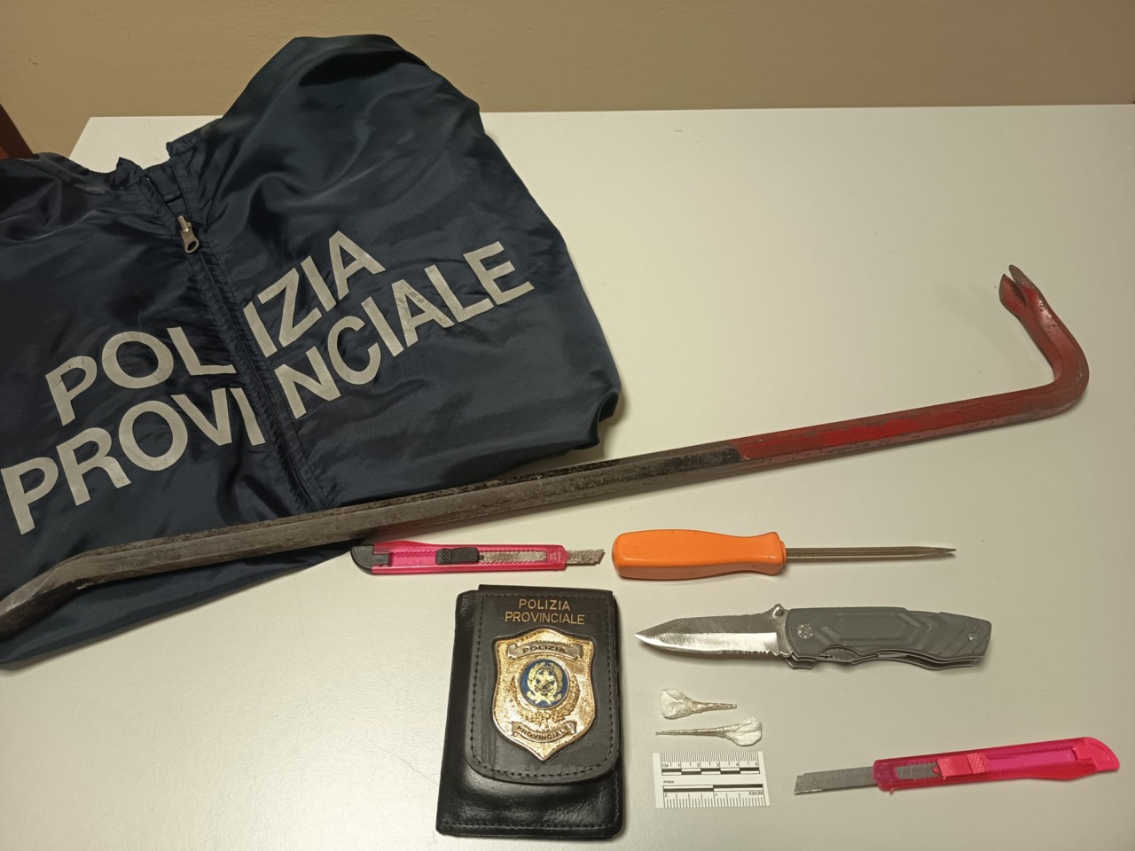 Gli agenti hanno quindi deciso di procedere al controllo del veicolo. A causa dell’evidente nervosismo del conducente, è stata eseguita una perquisizione che ha portato al rinvenimento di 0,5 grammi di cocaina e di diverse armi bianche (un coltello, due taglierini, un cacciavite e un piede di porco) custodite nel vano portaoggetti.