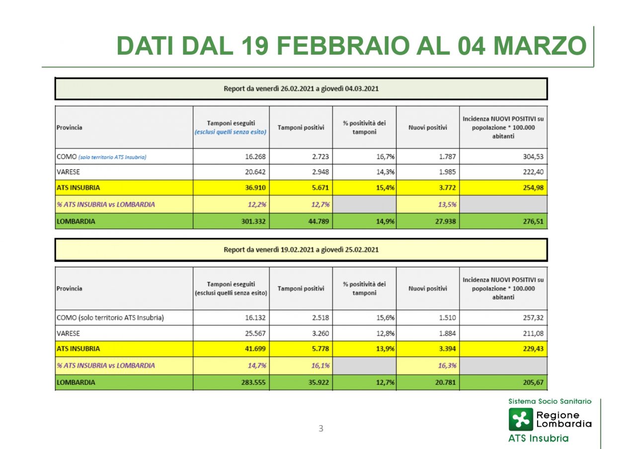 I numeri parlano chiaro: nella settimana dal 26 febbraio al 4 marzo sono stati registrati a Como 1787 nuovi positivi (la settimana precedente erano 1510 con un tasso di positività dei tamponi che balza al 16,7%. “Dall’andamento del contagio è molto evidente una tendenza marcata alla ripresa – prosegue Catanoso – c’è stato un aumento dell’indice Rt che ora è in lieve flessione, ci auguriamo possa andare avanti così grazie all’arancione rinforzato. Osservando il tasso di incidenza per ambito, pare però che siamo di fronte a un tentativo di ripartenza della terza ondata”.