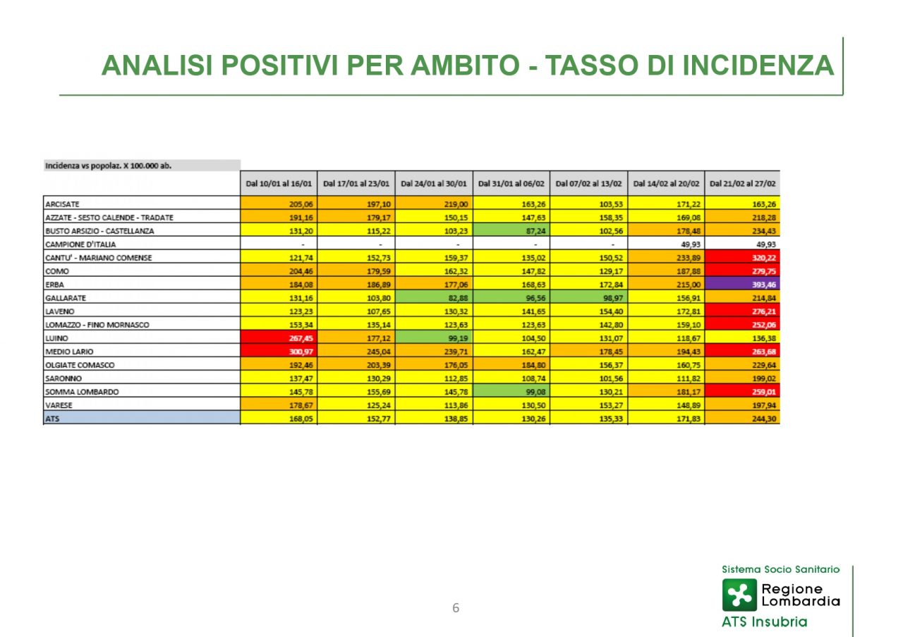 La situazione peggiore nell'Erbese che sfiora un'incidenza di 400 casi ogni 100mila abitanti. Varese e Saronno invece poco sotto i 200