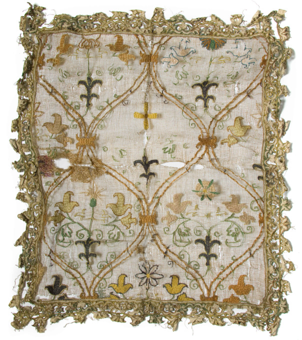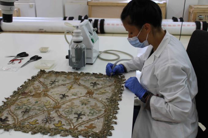 Grande cautela è stata necessaria per la delicatezza del buratto, esile supporto per il ricamo in seta con losanghe e fiori, il cui consolidamento ha garantito la sopravvivenza dell’intero manufatto.