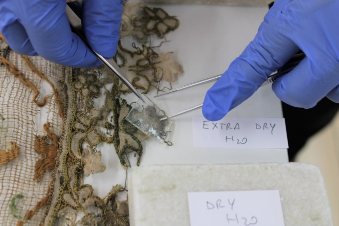 Il bordo del velo, costituito da fiori e foglie in lino intagliato, ha richiesto una cura attenta perché gli elementi decorativi erano attorcigliati su sé stessi e i filati metallici, fissati con seta a seguire il disegno, erano in parte scomposti e slegati: disteso il bordo e ricuciti nella corretta posizione i filati, è scaturita una nuova e sorprendente leggibilità.
