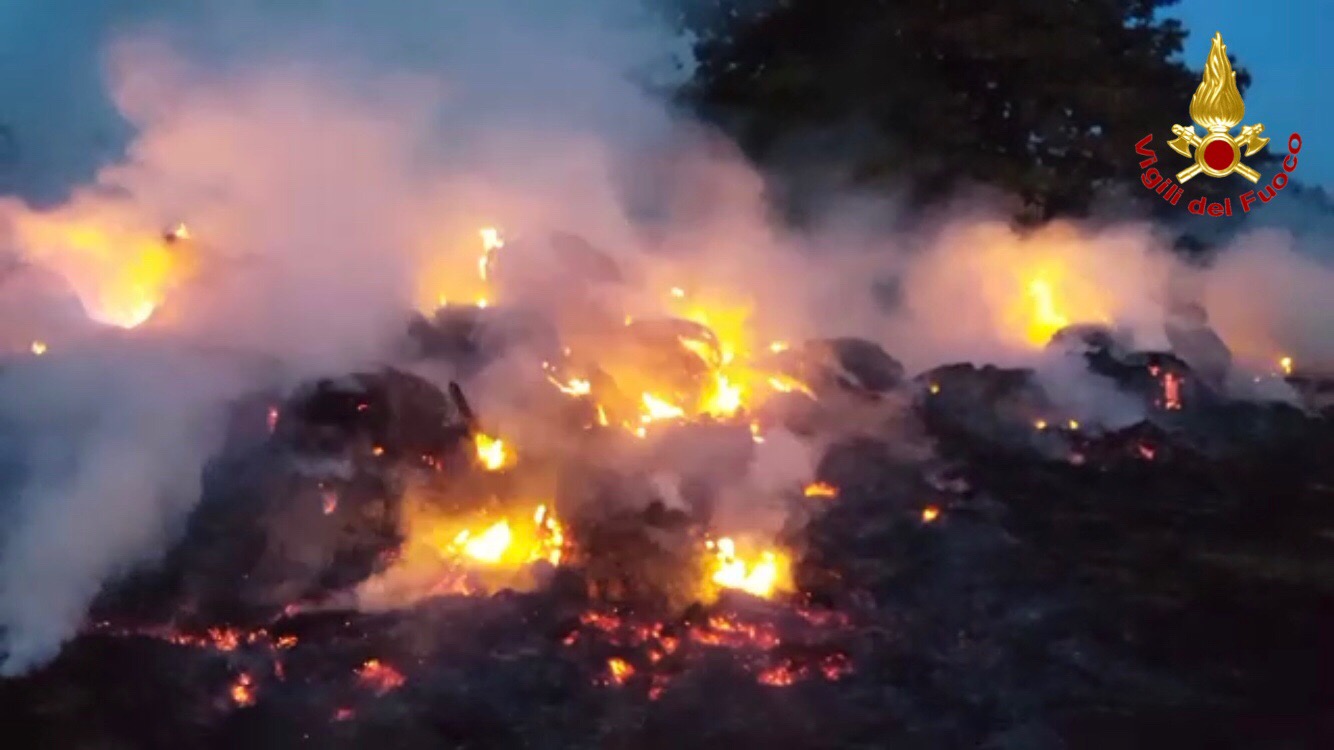 Incendio in azienda agricola a Sesto Calende: a fuoco una sessantina di rotoballe di fieno.