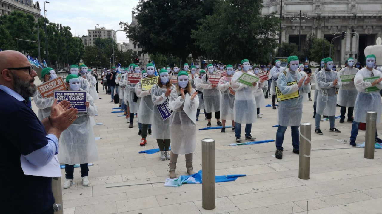 Infermieri in piazza per chiedere di non tornare invisibili. I camici bianchi del NurSind si sono riuniti in una manifestazione questa mattina davanti al Pirellone con camici, mascherine e cartelli per rivendicare maggiore attenzione una volta passata l’emergenza Covid.