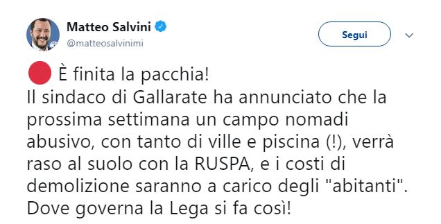Sgombero campo Sinti, Salvini “E’ finita la pacchia”