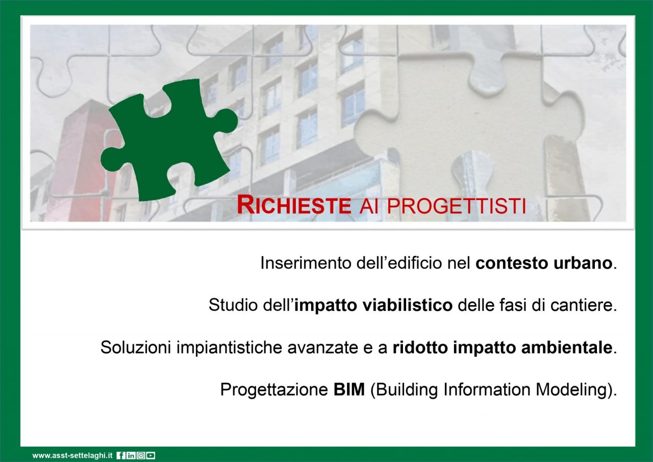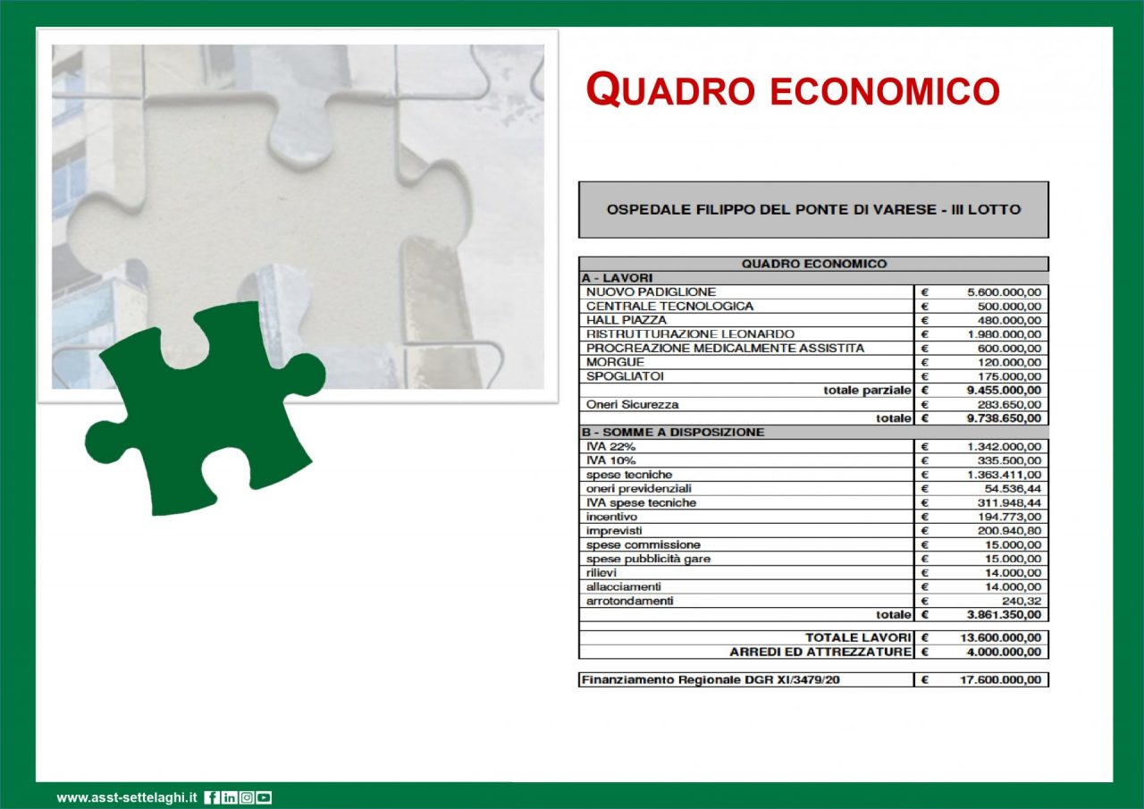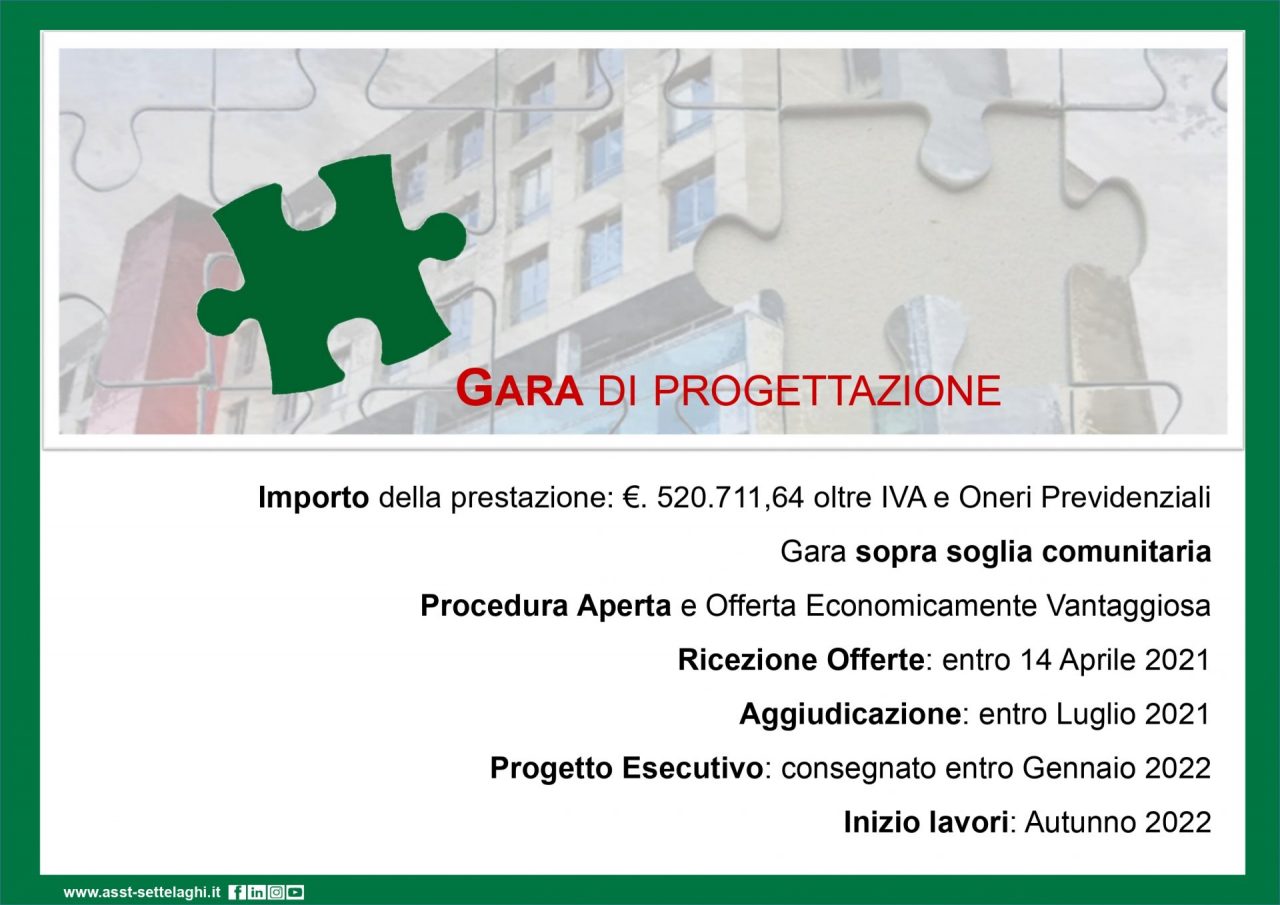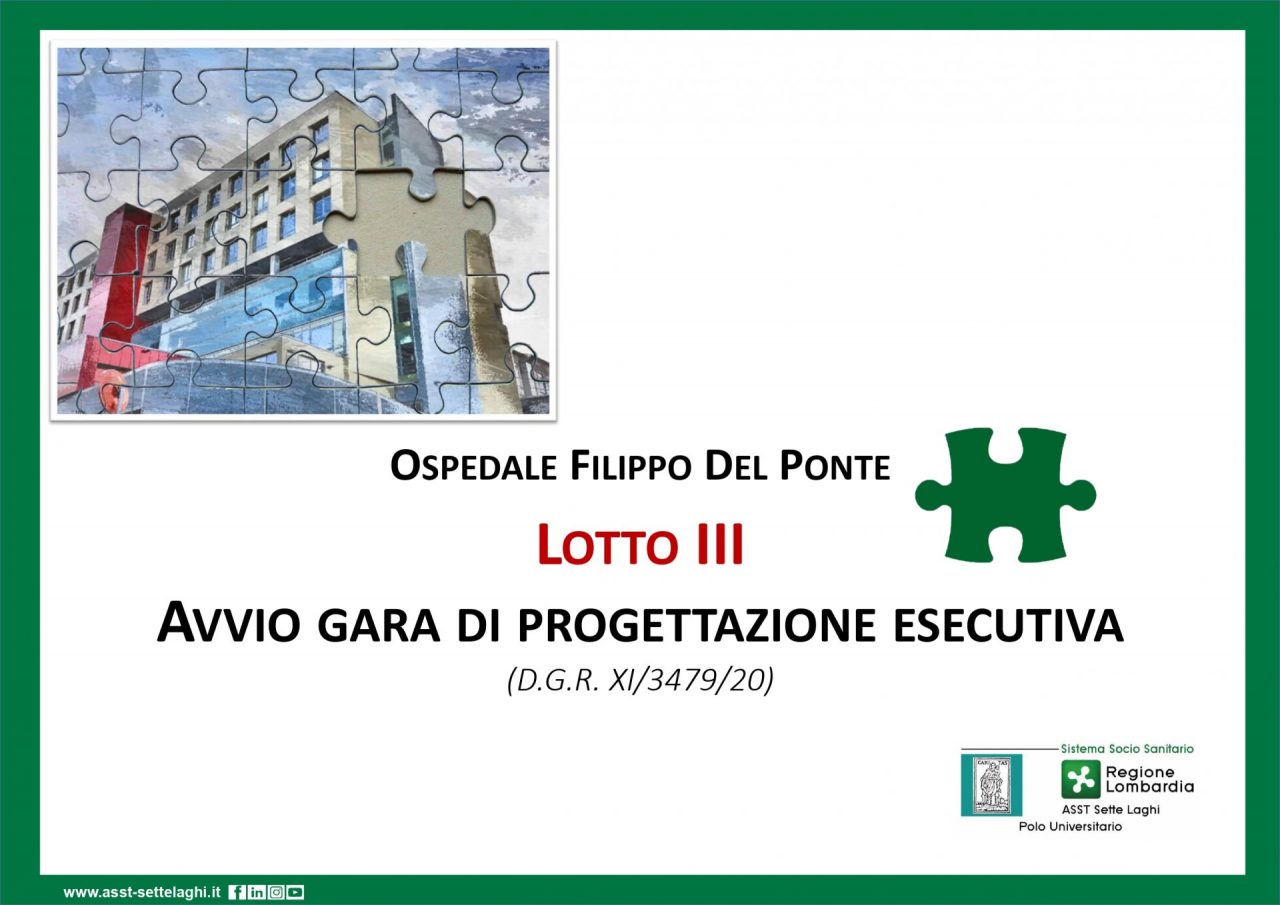 E’ stato indetto il bando per la gara di progettazione del terzo lotto dell’Ospedale Del Ponte per un valore complessivo di circa 660.000 euro. Le offerte potranno pervenire fino al 14 aprile prossimo. L’aggiudicazione è prevista entro l’estate.