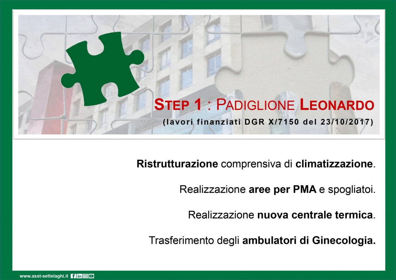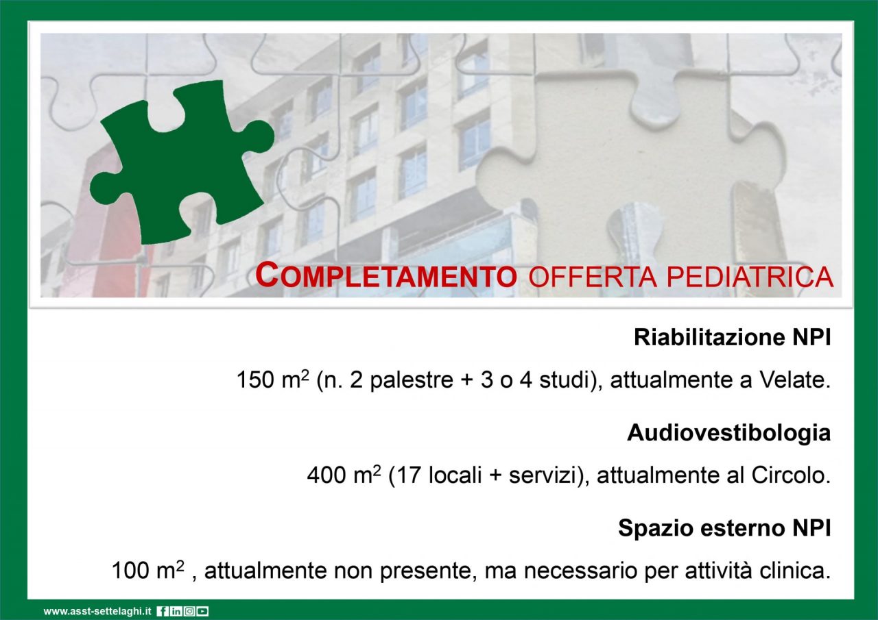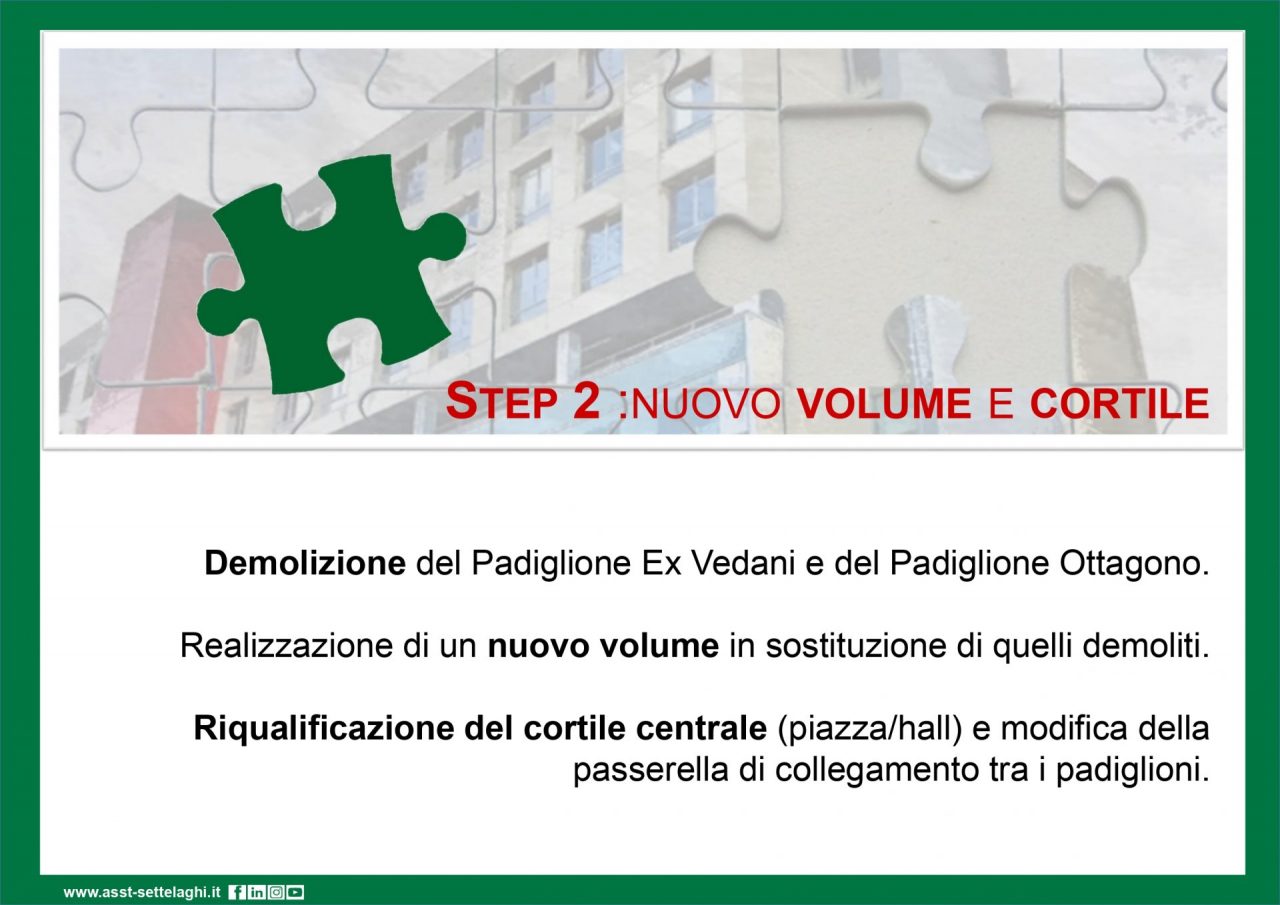 Il Padiglione Ottagono e parte del Padiglione Vedani verranno abbattuti e verrà realizzata una nuova struttura meglio collegata al Padiglione Michelangelo dove troveranno posto l’audiovestibologia (400 mq) e la riabilitazione della Neuropsichiatria Infantile con spazi sia all’interno che all’esterno. Nella progettazione del nuovo corpo di fabbrica sarà posta attenzione alle indicazioni del Comune di Varese circa la minimizzazione dell’impatto visivo del manufatto.