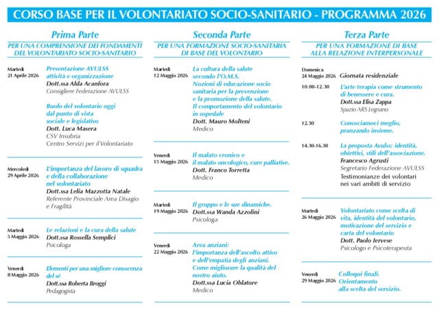 Il programma prevede incontri bi-settimanali (il martedì e il venerdì, dalle 20.45 alle 22.30 con ritrovo alle 20) nella sala riunioni al sesto piano dell’Ospedale Galmarini, durante i quali verranno affrontati temi fondamentali: dalla relazione di aiuto alla comunicazione efficace, dall’etica del volontariato alle basi dell’assistenza alla persona fragile. Non mancheranno momenti di confronto con professionisti del settore e testimonianze dirette di volontari già attivi sul territorio.