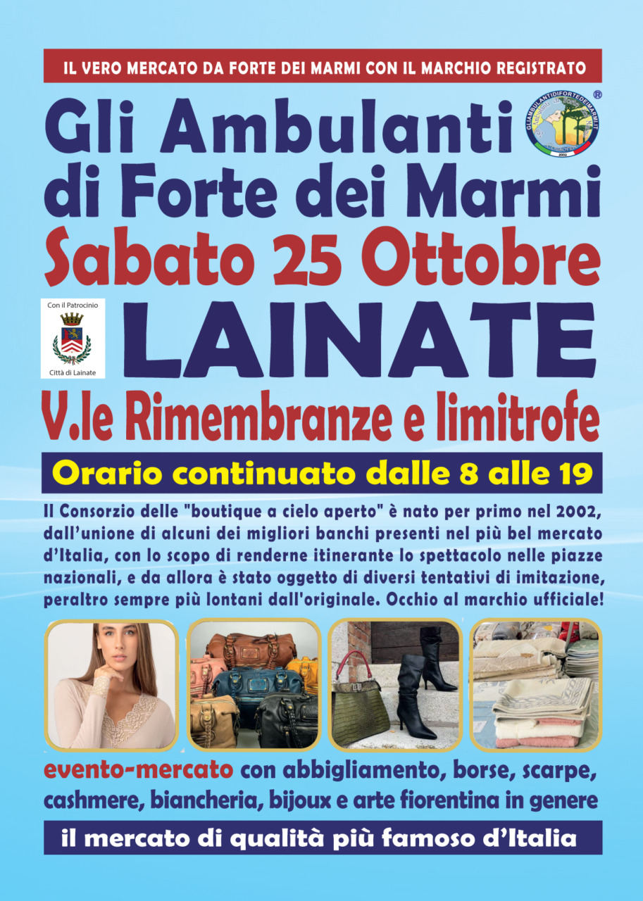 Gli Ambulanti di Forte dei Marmi®, le bancarelle del mercato di qualità più famoso d’Italia, da non confondere con alcuni tentativi di imitazione del loro originale format che circolano in regione, tornano per l’autunno a grandissima richiesta nel Milanese con il loro show itinerante all’insegna del meglio del Made in Italy artigianale e delle ultime tendenze della moda. Si potranno infatti ammirare le ormai mitiche boutique a cielo aperto® dell’originale Consorzio sabato 25 ottobre a LAINATE, in Viale Rimembranze e limitrofe, in una sempre attesa manifestazione patrocinata dall’amministrazione comunale. Dunque, un appuntamento da non perdere assolutamente per i tanti appassionati del genere, che lo hanno a lungo reclamato: una rassegna dello shopping più glamour e conveniente, con orario continuato, anche in caso di maltempo, dalle 8 alle 19.